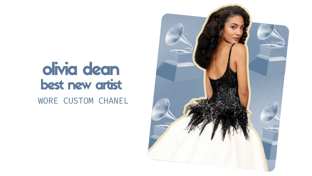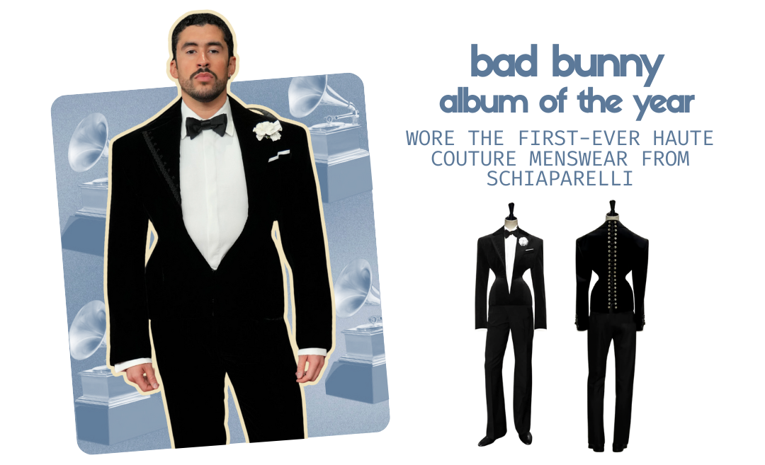 But before we get ahead of ourselves, let’s talk about what went down on the red carpet. Bad Bunny, already dominating the night with his historic Album of the Year win for Debí Tirar Más Fotos (the first all‑Spanish-language record to take home the top prize), hit the Grammy carpet in Schiaparelli menswear Haute Couture, marking a first for a male artist at the fashion house and serving bold, surrealist glamour the moment he stepped out — with the tailoring alone being a personal favorite. Olivia Dean, who took home Best New Artist and, in my opinion, was the best dressed of the night, turned heads in custom Chanel.