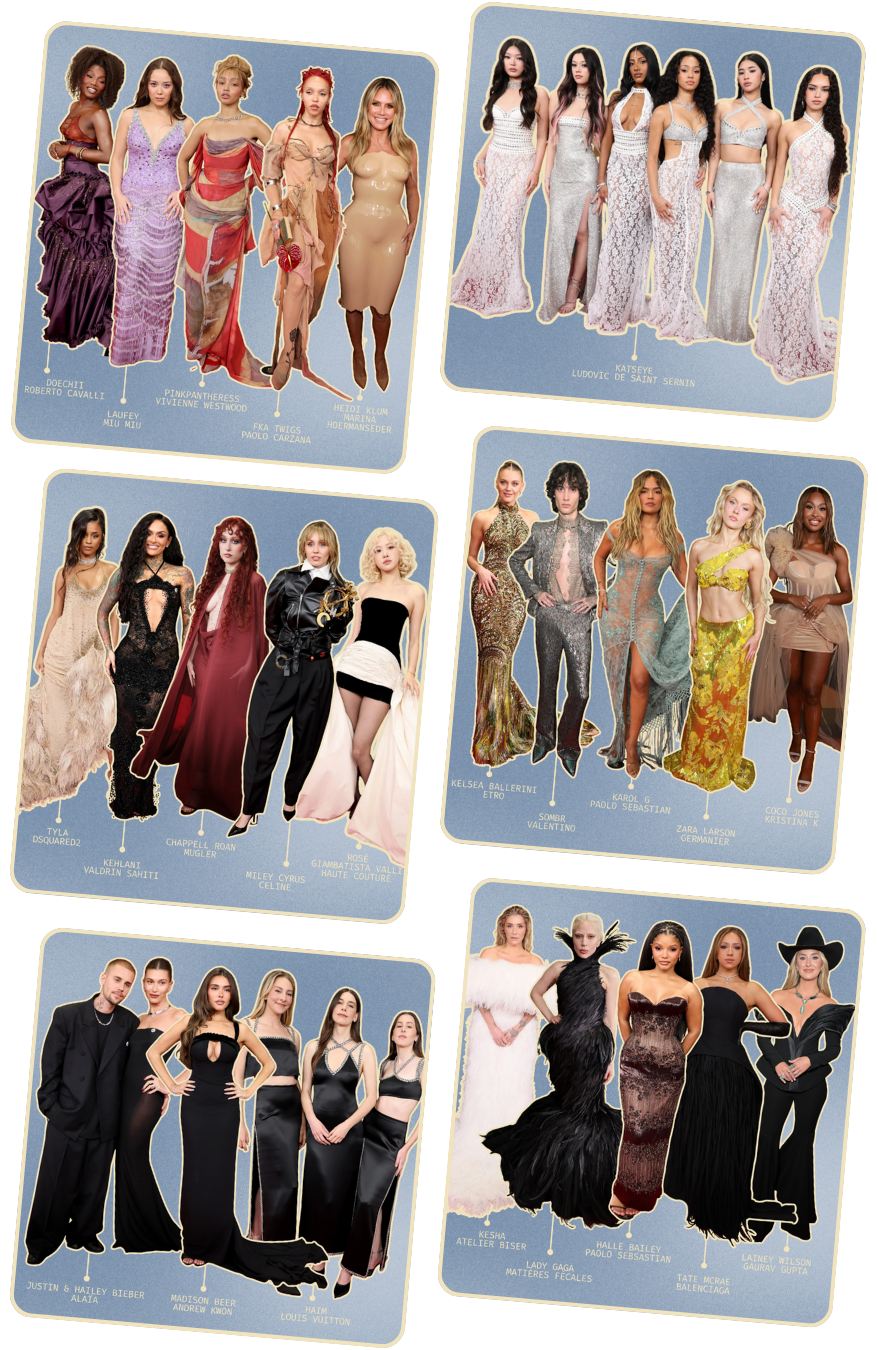 As for my favorite looks of the night, one thing was immediately clear: there was almost no color. I get it — this is the highest form of recognition for these artists, and many wanted to play it serious — but I still wish there had been a bit more personality on the carpet. Luckily, a few bold statements broke through the sea of blacks and whites. I’m living for FKA Twigs and Karol G in their Paolo Carzana looks, along with a ray of midnight sun from Zara Larsson (who, by the way, should have performed during the main event instead of the pre-show) in a stunning golden yellow Germanier two-piece. And the train drama was real: Tyla’s Dsquared2 gown and Doechii’s Roberto Cavalli piece both made carpets and cameras bow in awe.