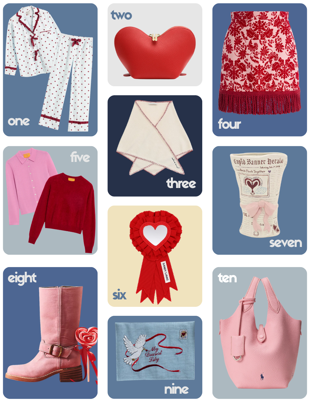 1. Damson Madder Antonella PJ Set, 2. Cuyana Mini Heart Case, 3. Favorite Daughter V-Day Triangle Scarf, 4. LA VESTE Cher Fringed Wool Mini Skirt, 5. Pink Guest in Residence Sweater & Red Guest in Residence Sweater, 6. Sandy Liang Mini I Love You Brooch, 7. Valentine’s Day Ceramic Newspaper Vase, 8. Fyre Boots Campus Buckle Boot, 9. Valentine’s Personalized Embroidered Keepsake Envelope, 10.Polo Ralph Lauren Small Polo Play Crossbody Tote